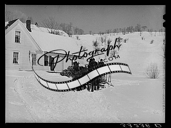 Clinton Gilbert,farmer,his helper hauling wood in sled. Woodstock,Vermont