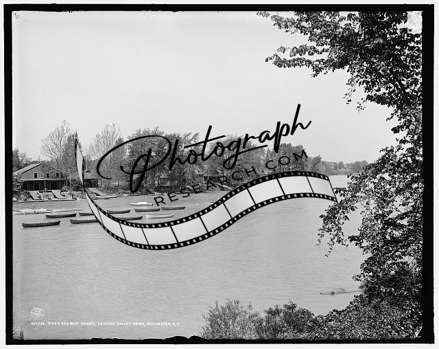 River,boat houses,Genesee Valley Park,canoes,water,Rochester,New York,NY,c1908