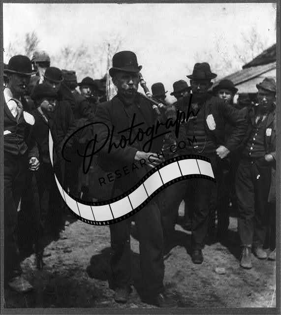 Members of Coxey's Army,men,boys,with flag bearer,trees