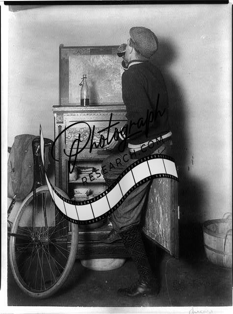 After the Ride,c1897,Man drinking from glass,piece of cake,icebox,bicycle