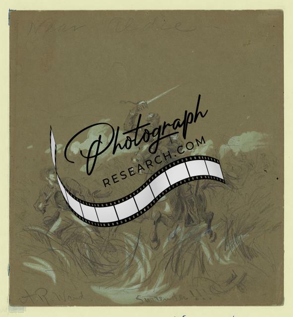 Inscribed upper left: [Thi]s represents a later moment in the fight at White oak swamp bridge than the sketch. These batteries got much injured during the battle- horses and men killed and guns dismounted. The enemy are coming down the distant slope to force the stream [,] troops advancing from the left to meet them. Inscribed lower right: 57.