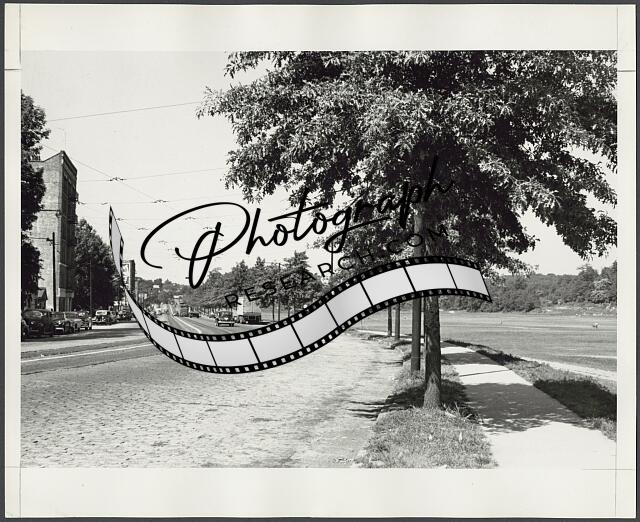 Photograph shows Broadway looking south from 196th St. with trees lining one side of the street and buildings on opposite side. Streetcar tracks run through center.