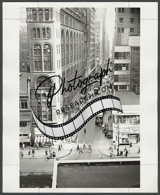Photograph shows a view of cars and buildings along Broadway from above. Billboard advertisement for Knickerbocker Beer can be seen in the background.