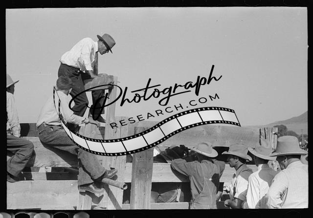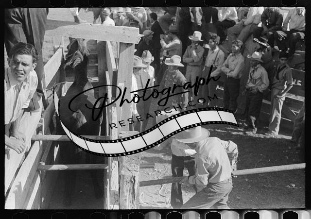 Title: Contestant at Bean Day rodeo examining saddle, Wagon Mound, New Mexico