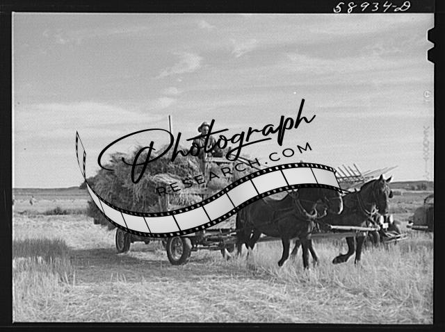 Title: Threshing wheat on Beerman's ranch at Emblem, Wyoming. He has about 160 acres (quarter section), about forty-three in wheat, the rest in oats, beans, and alfalfa. This year he is getting between fifty-five and sixty bushels per acre, whereas ordinarily he gets about forty bushels wheat per acre. He has lived on the place forty years and owned it for the past twenty.