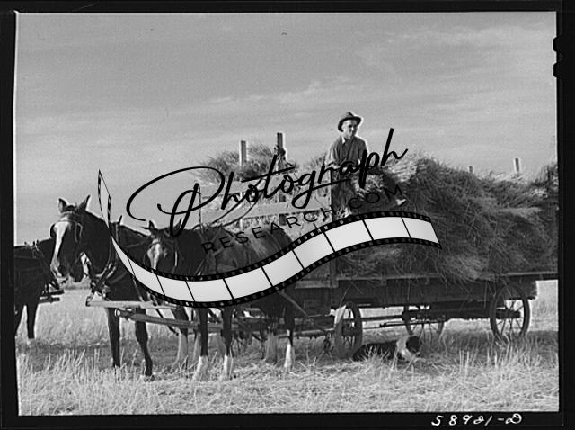 Title: Helper on wagonload of wheat to be threshed on Beerman's ranch at Emblem, Wyoming. He has about 150 acres in all (quarter section), about forty-three in wheat; the rest in oats, beans, and alfalfa. This year they are getting between fifty-five and sixty bushels wheat per acre, whereas ordinarily he gets about forty bushels per acre. He has lived on the place forty years, owned it for the past twenty years.