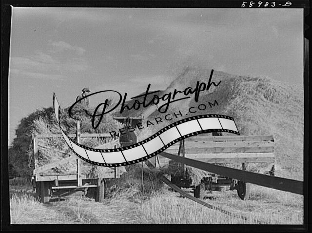 Title: Helper on wagonload of wheat to be threshed on Beerman's ranch at Emblem, Wyoming. He has about 150 acres in all (quarter section), about forty-three in wheat; the rest in oats, beans, and alfalfa. This year they are getting between fifty-five and sixty bushels wheat per acre, whereas ordinarily he gets about forty bushels per acre. He has lived on the place forty years, owned it for the past twenty years.
