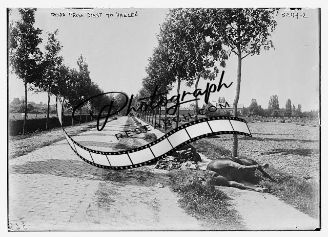 Road from Diest to Haelen,Netherlands,dead horses,trees,Bain News Service