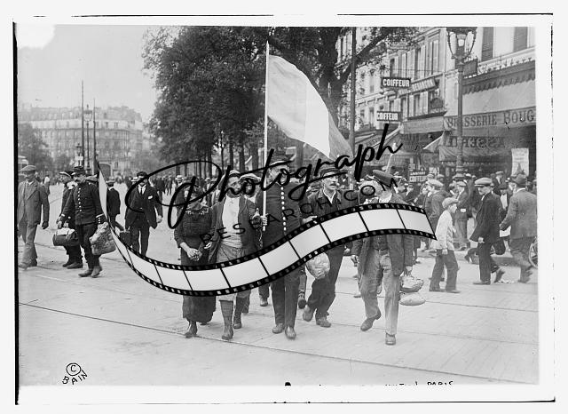 French Reservists going to R.R. station,Paris,France,Railroad,Flag,store fronts