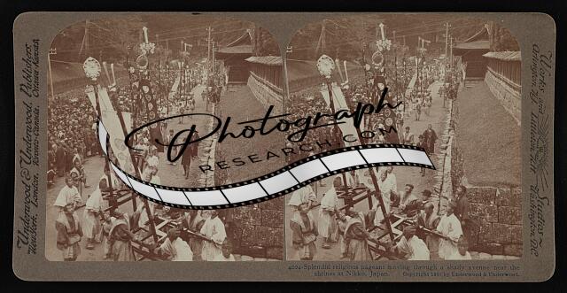 Splendid religious pageant moving through a shady avenue near the shrines at Nikko, Japan