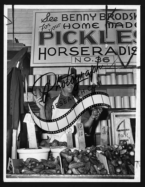 Benny Brodsky,pushcart vendor,at his stand,1940,street vendor,New York,NY,market