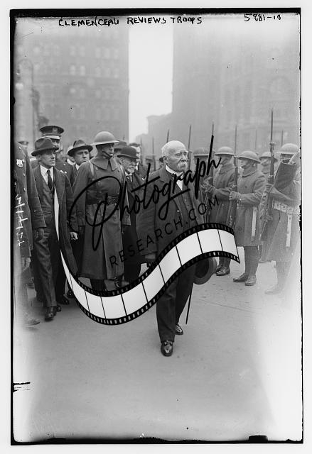 Georges Clemenceau reviews troops,Prime Minister,France,soldiers,rifles,coats