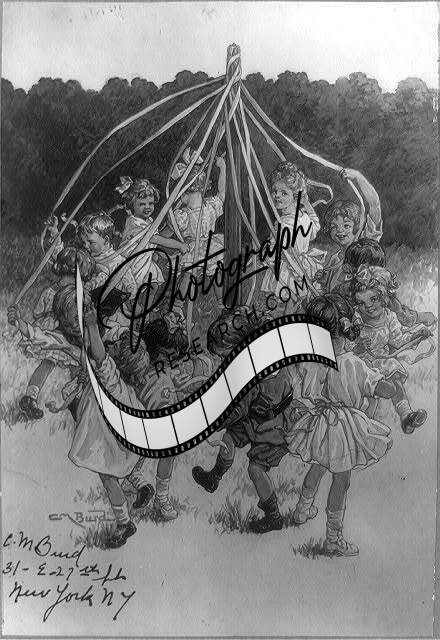 May pole,ribbon,children,playing outdoors,celebrations,festivals,CM Burd,c1917