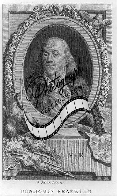 Summary: Print shows Benjamin Franklin, head-and-shoulders portrait, left profile, in oval with ribbon at top.