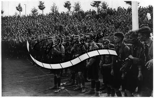 Large mass of Hitler Youth standing at ease in Nuremberg during Reichsparteitag, Sept. 1933