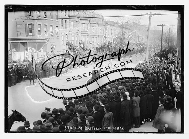 Runners at start of Brooklyn Marathon,New York,NY,horseback rider,crowd,1909