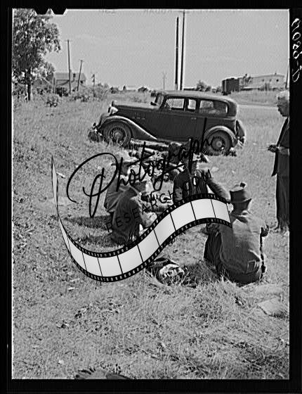 Title: Unemployed fruit tramps sitting along the railroad tracks. Berrien County, Michigan