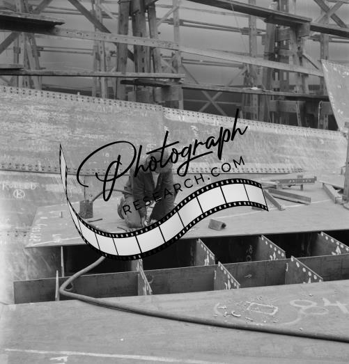 Summary: Photographs show middle and late stages of ship construction. Views from all angles of ships on ways and fitting docks. Lifting stacks into place, welding decks, frames, etc.; erecting bulkheads, installing machinery, painting, inspecting completed work. Schedule sign reporting daily progress.