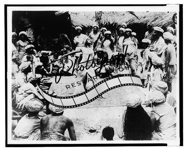 Between Savage & Tiger,man tied to stake in Hindoos clustered,Shaking fists,1914