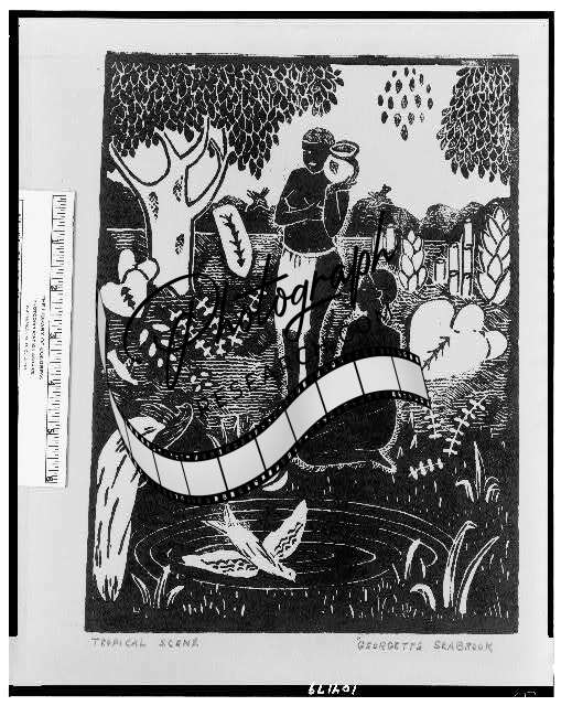 Tropical scene,native women,water,birds,plants,leaves,Georgette Seabrook,1933