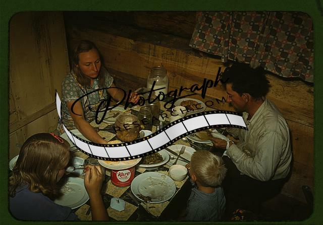 Faro Caudill family eating dinner,dugout,Pie Town,New Mexico,NM,Russell Lee,1940