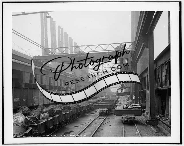 Loading scrap,Homestead Steel Works,railroad cars,shipping,Pennsylvania,c1908