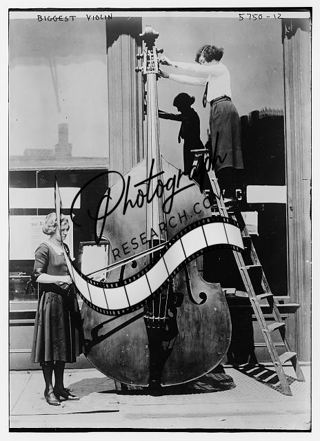 Largest violin,stringed musical instruments,bows,women,ladders,Bain News Service