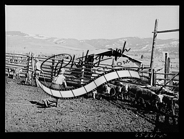 Title: Bitterroot Valley, Montana. Driving cattle into corral for branding and dehorning