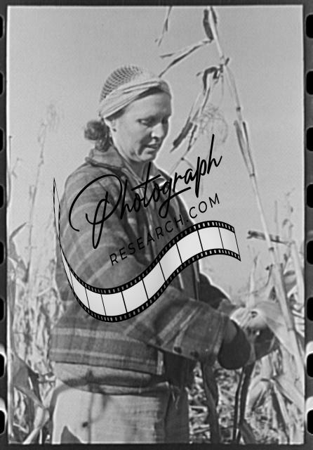 Title: Farmer (widow) husking corn. She lives on Black Canyon Project and has a FSA (Farm Security Administration) loan. Canyon County, Idaho