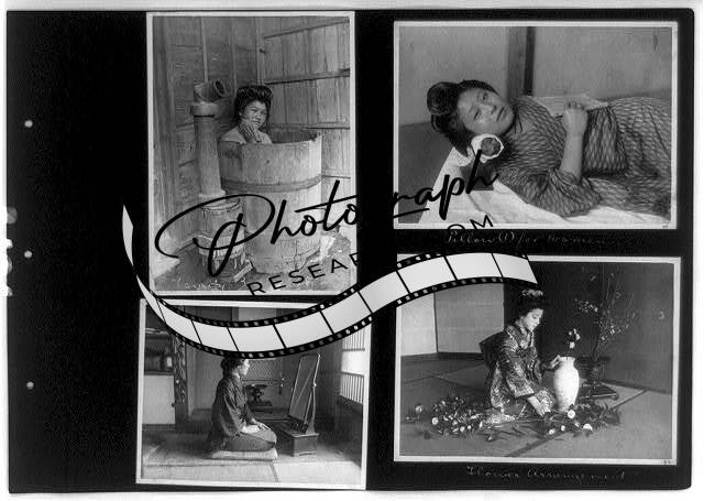 Woman taking bath in tub,head rest,mirror,arranging flowers in vase,Japan,c1915