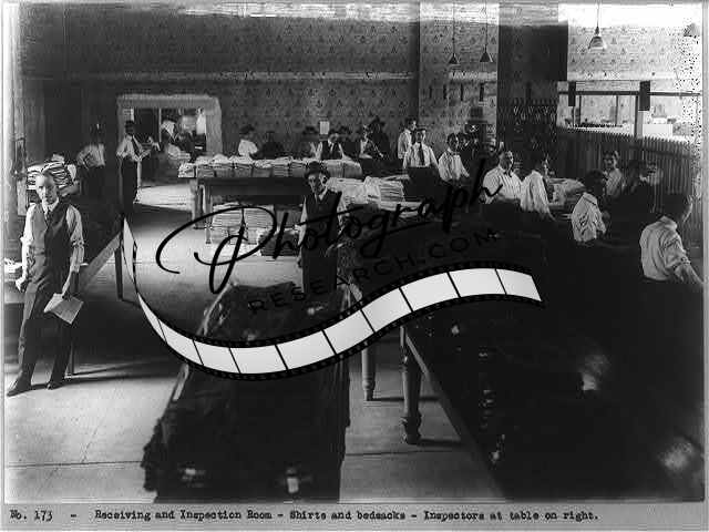 Inspection room,shirts,bedsacks,inspector,table,clothing,quality control,IN,1919