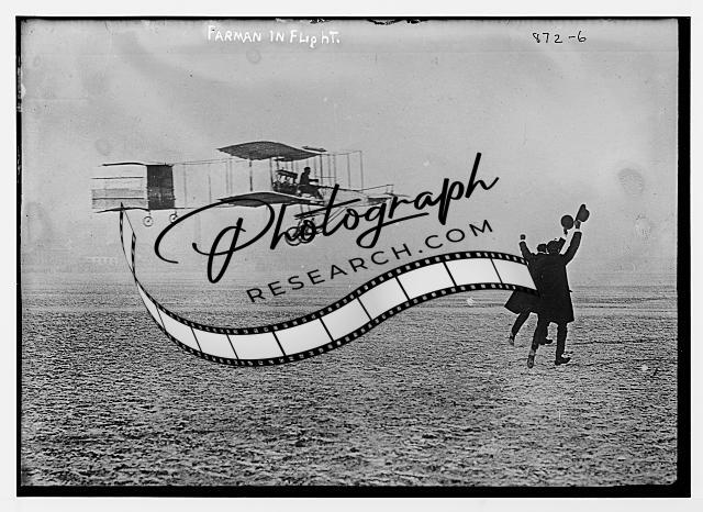 Farman flying machine,in flight,airplane,2 people,arms raised (cheering?),1909