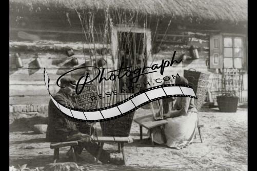 Man,woman making baskets outdoors,small child watches,Poland,1918-1921?