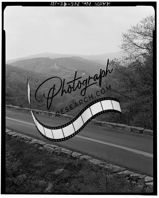 Title: 113. Doughton Park Recreation Area. Distant view of road cut, roadway, and stone railing at ice cliffs. Looking northeast. - Blue Ridge Parkway, Between Shenandoah National Park & Great Smoky Mountains, Asheville, Buncombe County, NC