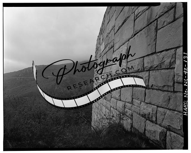 Title: 133. View of rock cut at base of rough ridge and roadway crossing unnamed viaduct on Grandfather Mountain with the Great Wall of China supporting the curve in the distance. Looking southeast. - Blue Ridge Parkway, Between Shenandoah National Park & Great Smoky Mountains, Asheville, Buncombe County, NC