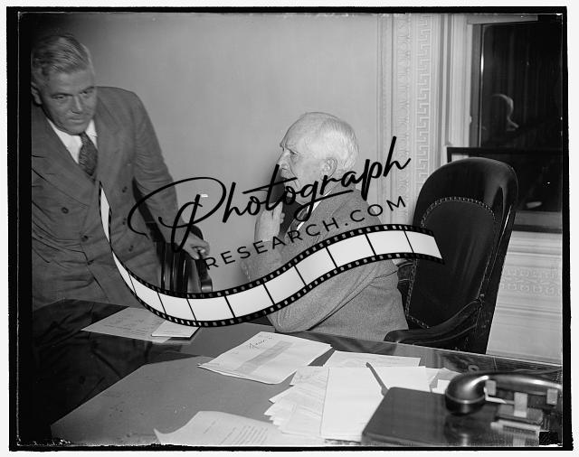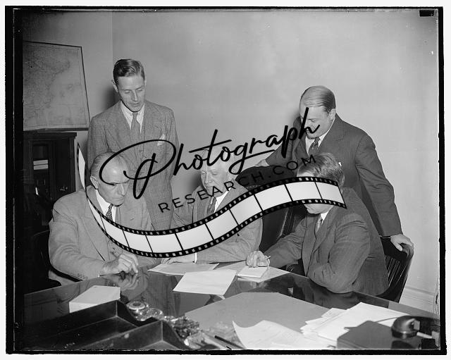 Title: Discuss stock market situation. Washington, D.C., Oct. 19. The Board of governors of the Federal Reserve System met today to discuss the current slump in the stock market. The board, with its control of margin requirements, and the Securities Exchange Cimmission, with its power over trading practices, now are the focal points of possible federal action. In the photograph, left to right: M.S. Szymczak, John McKee, Ronald Ransom, Vice Chairman; Marriner Eccles, Chairman; and Chester C. Davis. 10/19/37