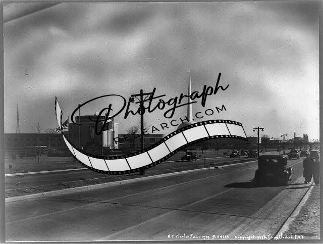 Entrance,New York World's Fair,buildings,automobiles,crowds,roads,flags,NY,c1939