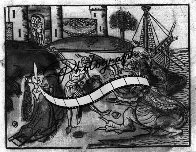 Knight in armor slaying dragon,1485,Raoul Lefevre,Woman