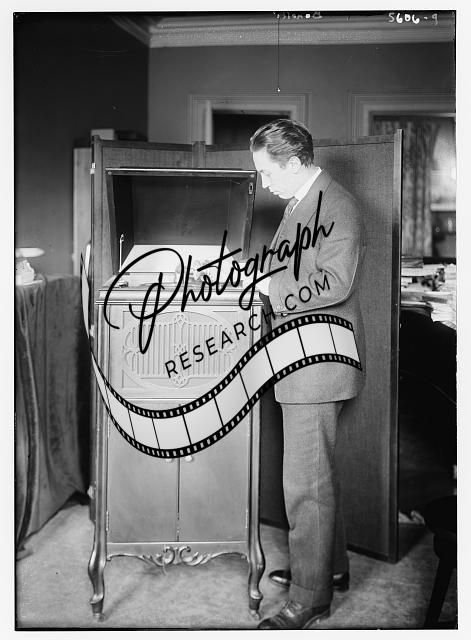 Bonelli putting record,machine,music players,victrolas,men,Bain News Service