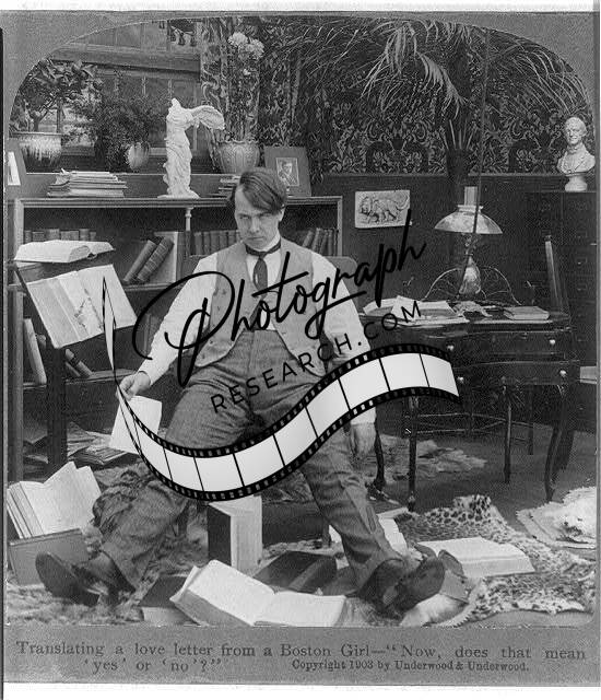 Translating Love Letter,Boston Girl,Confused looking Man,c1903,Open Books,Humor