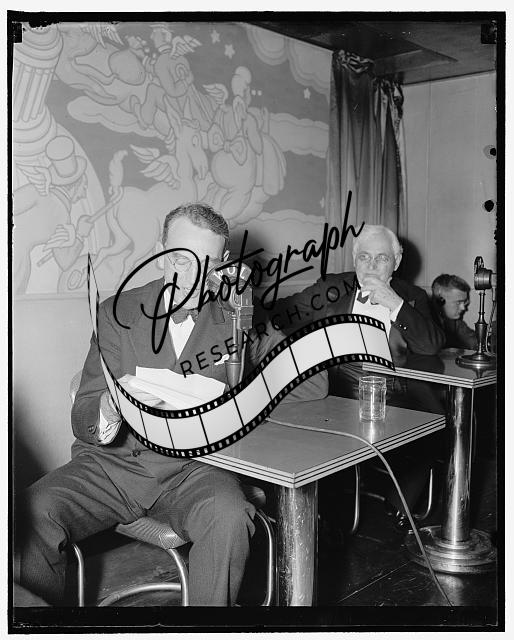 Title: Boston furrier appears before Senate Naval Affairs Committee. Washington, D.C., May 17. Philip Krupp, a Boston furrier, today sought the Senate Naval Affairs Committee support for his drive to reinstate his 22 yr. old brother in the Naval Academy and remove from his name the 'stigma of falsehood.' He petitioned the committee to approve a bill directing the reinstatement of his brother, Fredrick Krupp, who, he contended, was 'forced to resign' from the academy in January because of a thoughtless statement with attempt to decieve. Philip said his brother had been refused a position with the Martin Aircraft Co. and denied admission to the Mass. Institute of Technology because of an untrue statement attached to all of Fred's records from the academy that he was permitted to resign for the good of the navy, he is shown left; pleading the case before the acting chairman of the committee Sen. Guy Gillette. D. of IA.