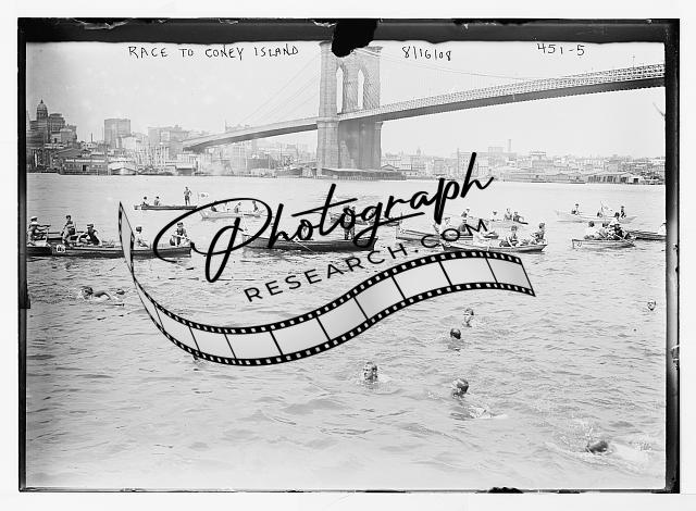 Swimming race to Coney Island,life boats,swimmers,New York,NY,bridge