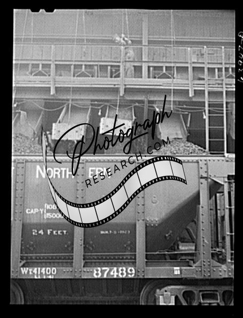Title: Washed ore being loaded into seventy ton cars for shipment to Duluth-Superior ore docks. Concentration plant at Bovey, Minnesota