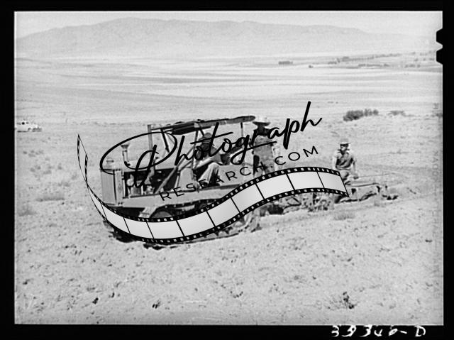 Title: Ericson brothers' cooperative tractor, bought with FSA (Farm Security Administration) loan, plowing dry land. Irrigated land is seen in the middleground of the picture. Box Elder County, Utah