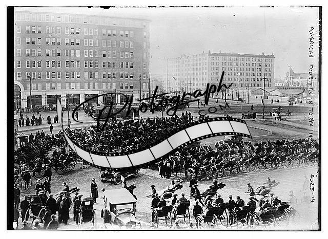 American tourists in Tokyo,Shot of crowd with street,buildings,1926,automobiles