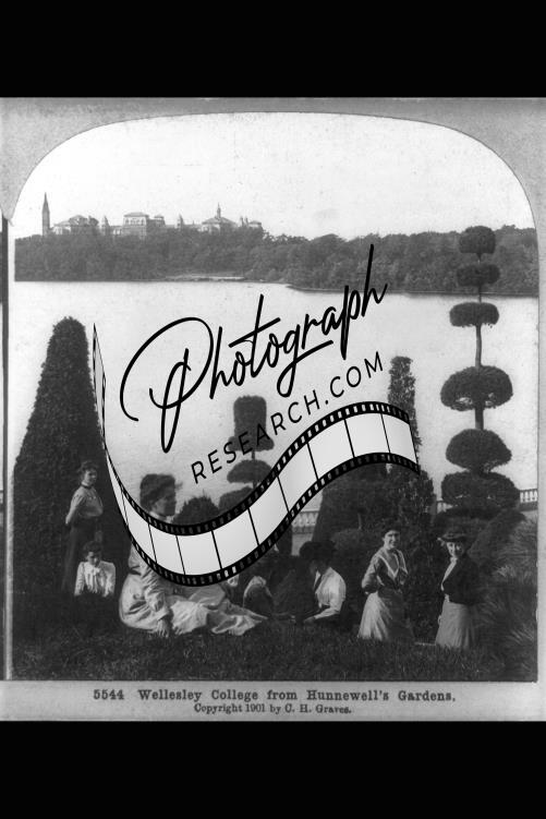 Wellesley College from Hunnewall's Gardens,c1901,Sculptured Hedges,Women,Lake