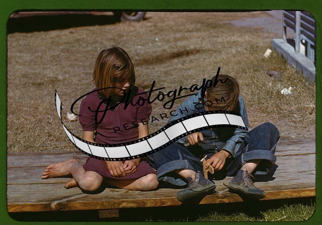 Boy building model airplane,girl watches,FSA labor camp,Robstown,TX,Texas,1942