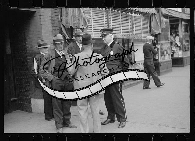 Policeman talking with group of men,South Omaha,Nebraska,NE,November 1938