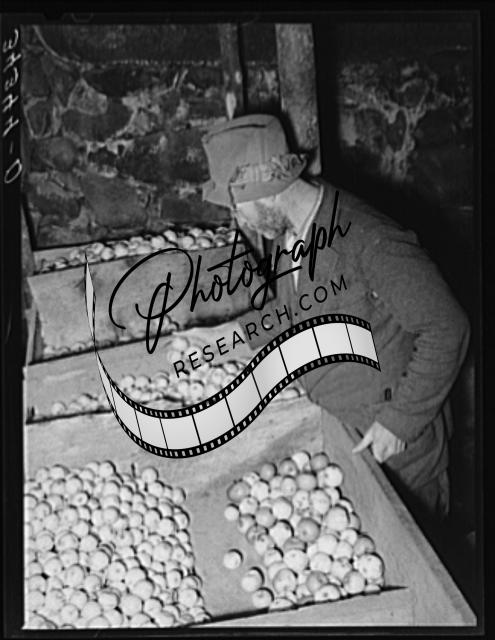 Title: Wife of FSA (Farm Security Administration) client looking at canned goods stored in her cellar. Near Bradford, Vermont, Orange County