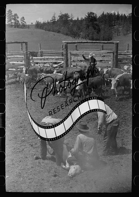 Branding calf,Quarter Circle U Ranch roundup,Montana,MT,Arthur Rothstein,1939,1